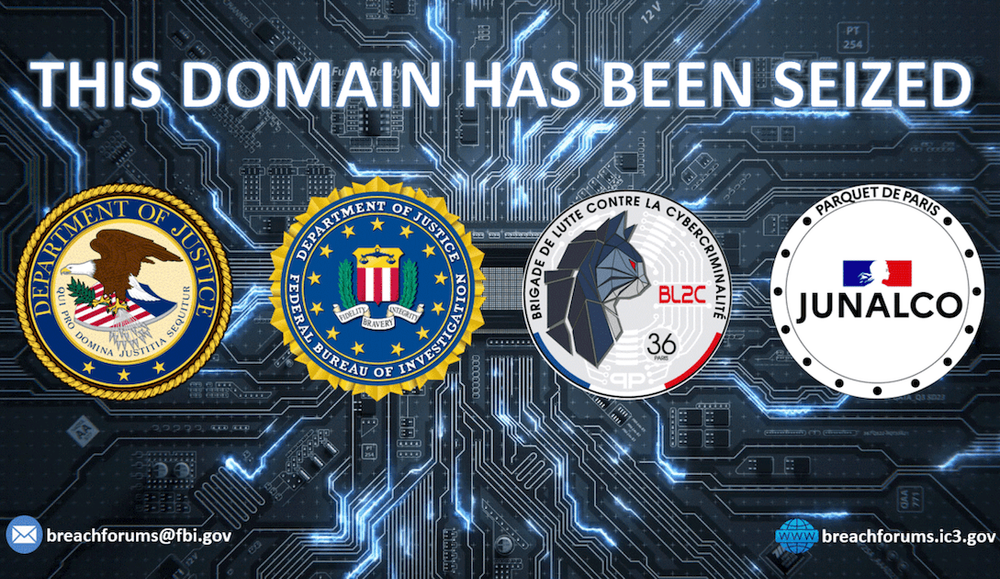 Late on Thursday, the breachforums.hn address was replaced with a banner that says “this domain has been seized” above the insignias of the FBI and Justice Department as well as France’s Brigade Centrale de Lutte Contre la Cybercriminalité and Juridiction Nationale de lutte contre la Criminalité Organisée.