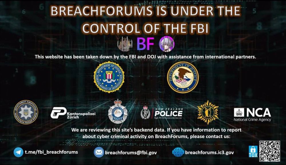 “This website has been taken down by the FBI and DOJ with assistance from international partners,” the notice says. “We are reviewing the site's backend data. If you have information to report about cyber criminal activity on BreachForums, please contact us.”