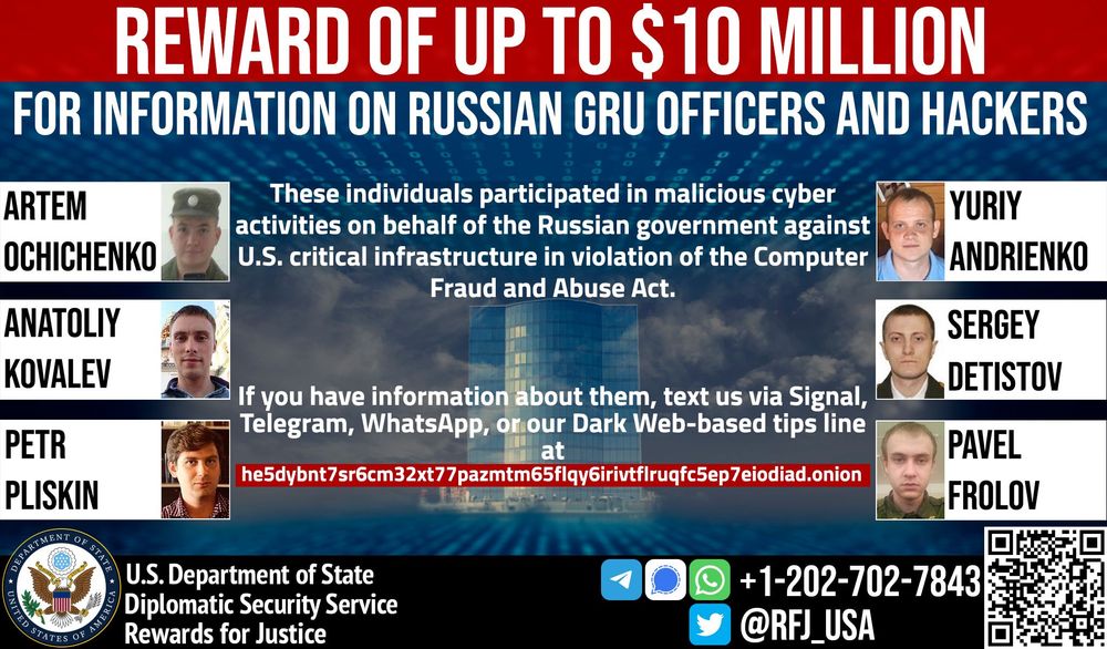 REWARD! Up to $10M for information on 6 Russian GRU hackers. They targeted U.S. critical infrastructure with malicious cyber ops. Send us info on their activities via our Dark Web-based tips line at: https://t.co/WvkI416g4Whttps://t.co/oZCKNHU3fY pic.twitter.com/u1NMAZ9HQl
