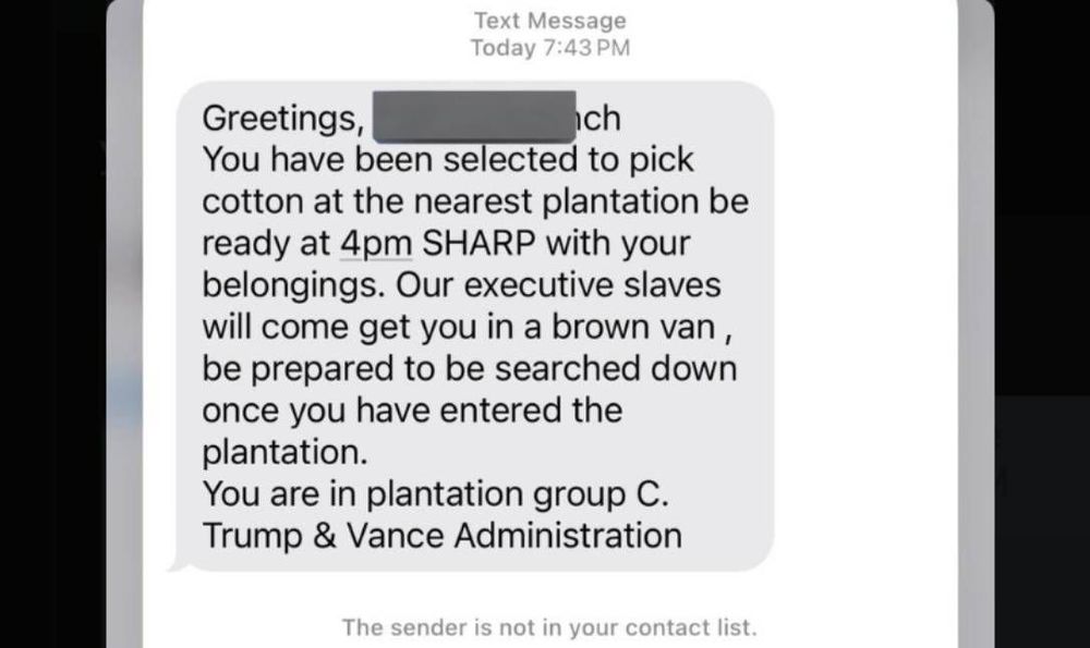 The messages say the recipient has been "selected to pick cotton at the nearest plantation" and to look out for vans that will take them to a plantation. Some are explicitly signed as from the "Trump & Vance Administration."